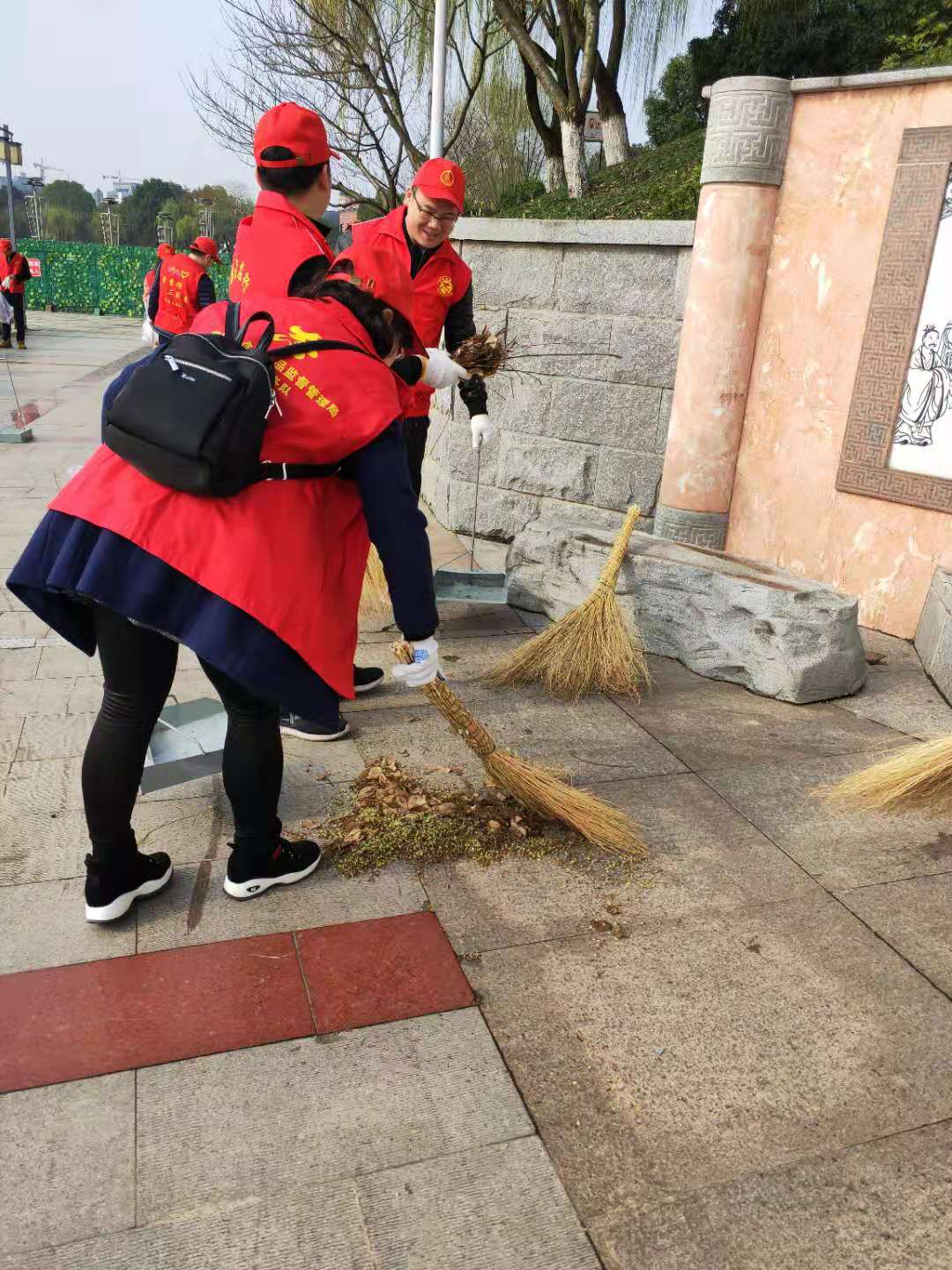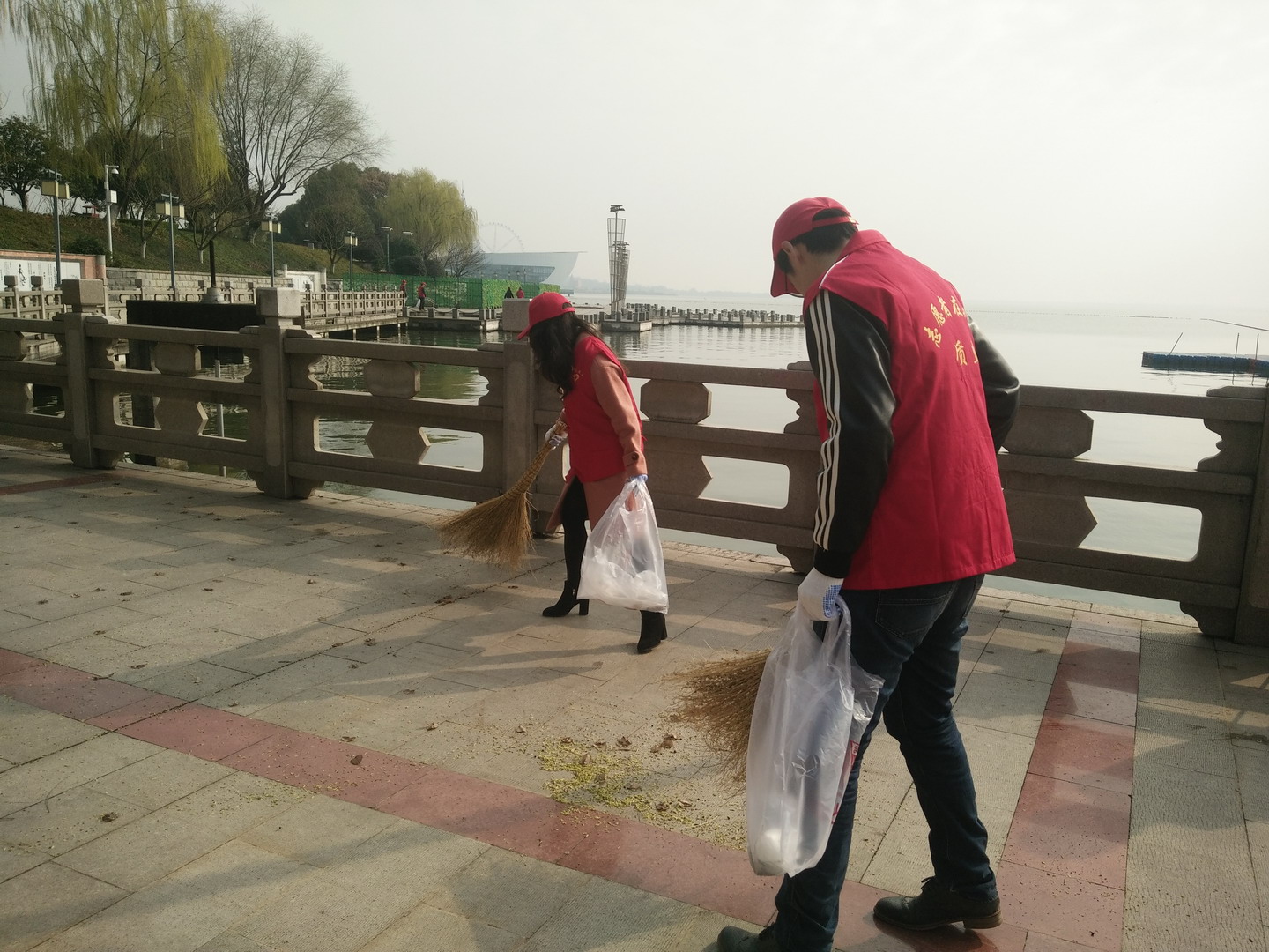 上午9点,志愿者们穿着红色马甲,戴着志愿者服务帽子,手拿垃圾钳、扫帚等工具,沿着湖边走,一边仔细清理湖边的落叶、烟头、碎纸屑塑料袋等垃圾。同时,向在河边散步的群众宣传“崇尚文明、讲究卫生、遵守公德”的文明理念。志愿者们热情高涨,不怕脏,不怕累,认真地把垃圾捡干净,在道路两侧形成一道独特的风景。