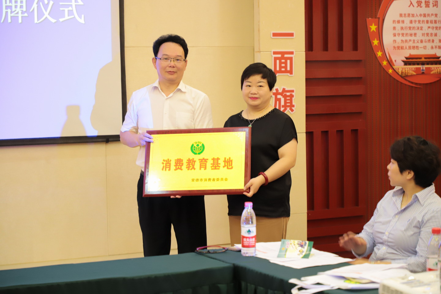 图为常德市市场监督管理局党组成员谭玉龙为消费教育基地授牌