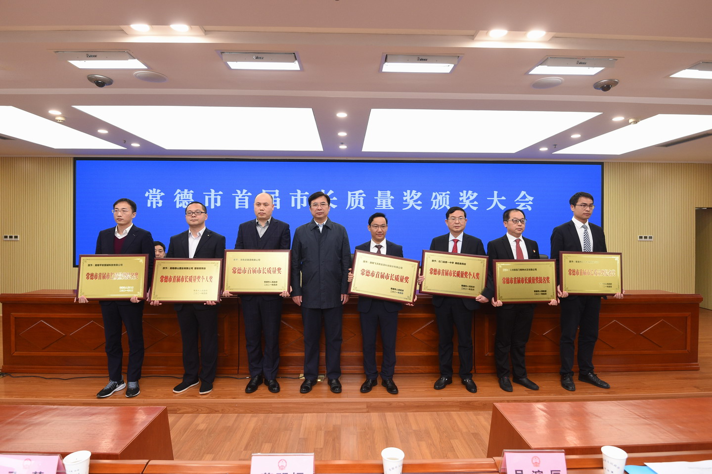 会上,副市长杨成英宣读了《常德市人民政府关于表彰常德市首届市长质量奖获奖组织和个人的决定》。为进一步增强全社会质量意识,根据《常德市市长质量奖管理办法》,经申报、评审、研究和公示,市人民政府决定,授予湖南飞沃新能源科技股份有限公司、湖南武陵酒有限公司首届市长质量奖,授予石门县第一中学侯宏泉、湖南德山酒业有限公司曾铁军2名个人首届市长质量奖个人奖,授予葛洲坝石门特种水泥有限公司、湖南平安医械科技有限公司、常德市三一机械有限公司首届市长质量奖提名奖。
