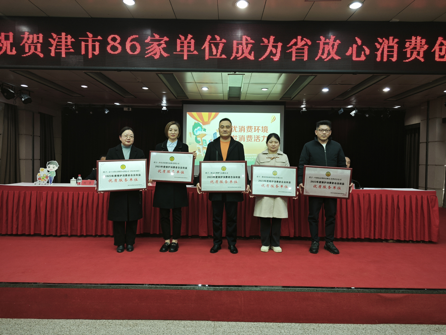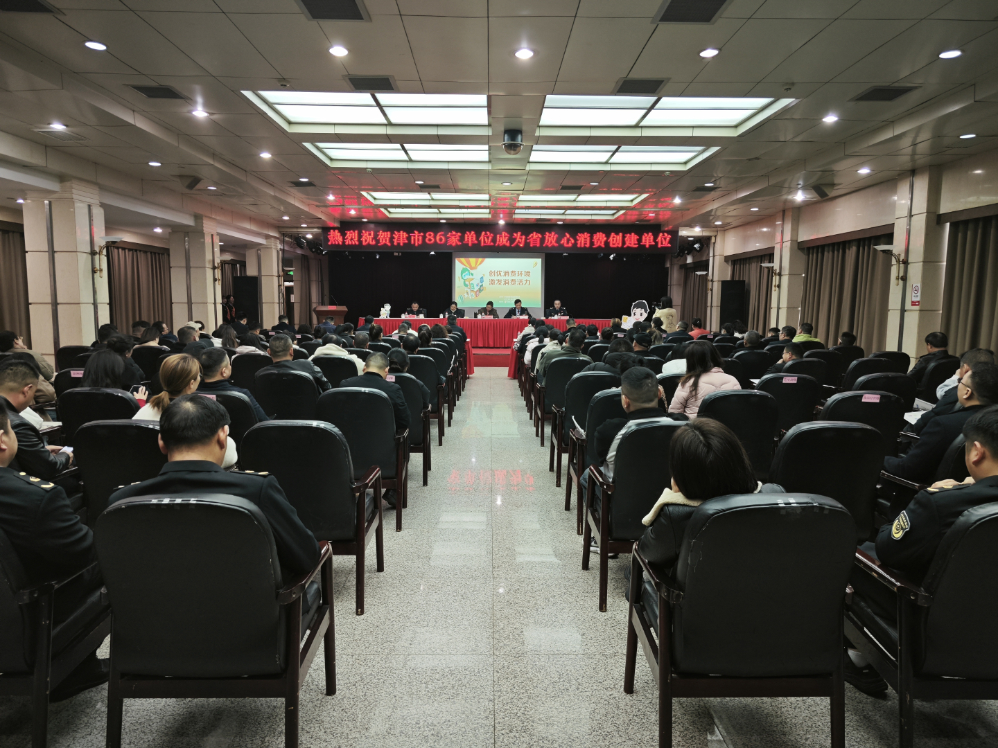 津市市市场监管局相关工作人员,20 家优质服务单位负责人,86 家放心消费创建入驻单位代表参加大会。