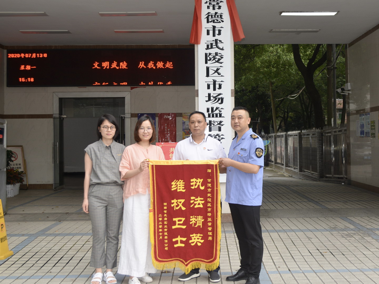 2020年7月13日,湖南长康实业有限公司专程派人来到武陵区市场监管局,送上一面“执法精英 维权卫士”锦旗,对市场监管部门雷厉风行的执法态度和高效务实的工作作风表示称赞与感谢。