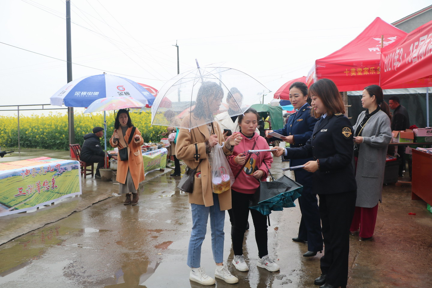 小雨将金黄的油菜花装扮的晶莹剔透,景区游客络绎不绝,兴致满满,赏花拍照、吃蒿子粑粑、购买农副食品……宣传人员与游客也频频互动,引导树立消费维权意识,亦是别样风景。