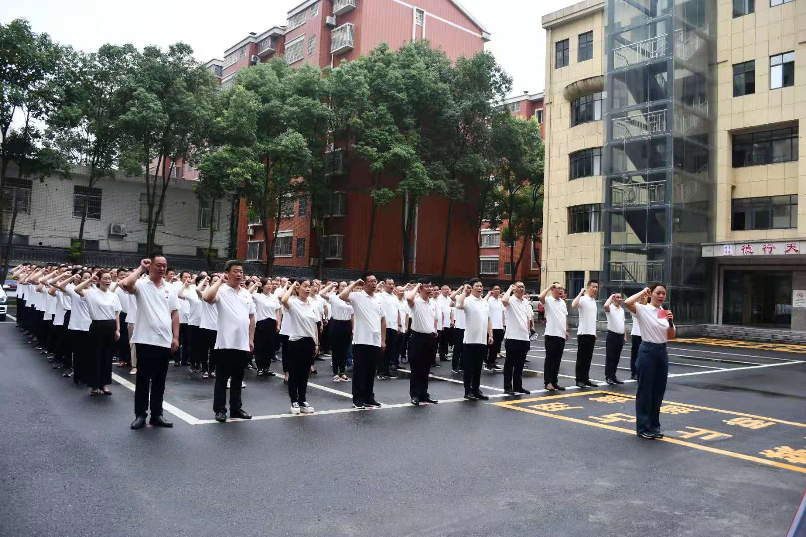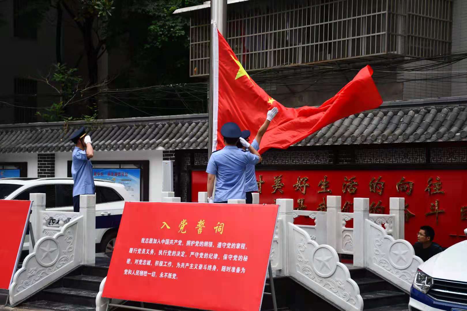 清晨时分,清风徐来,澧县市场监管局国旗护卫队的旗手英姿飒爽,迈着整齐的步伐,铿锵有力地走上升旗台。在雄壮的国歌声中,鲜艳的五星红旗冉冉升起,迎风飘扬,179名党员和干部职工仰望国旗、心潮澎湃。全体党员重温入党誓词,庄重的誓言在活动现场回响,展示着他们坚定不移的政治信念和矢志奋斗的坚强决心。