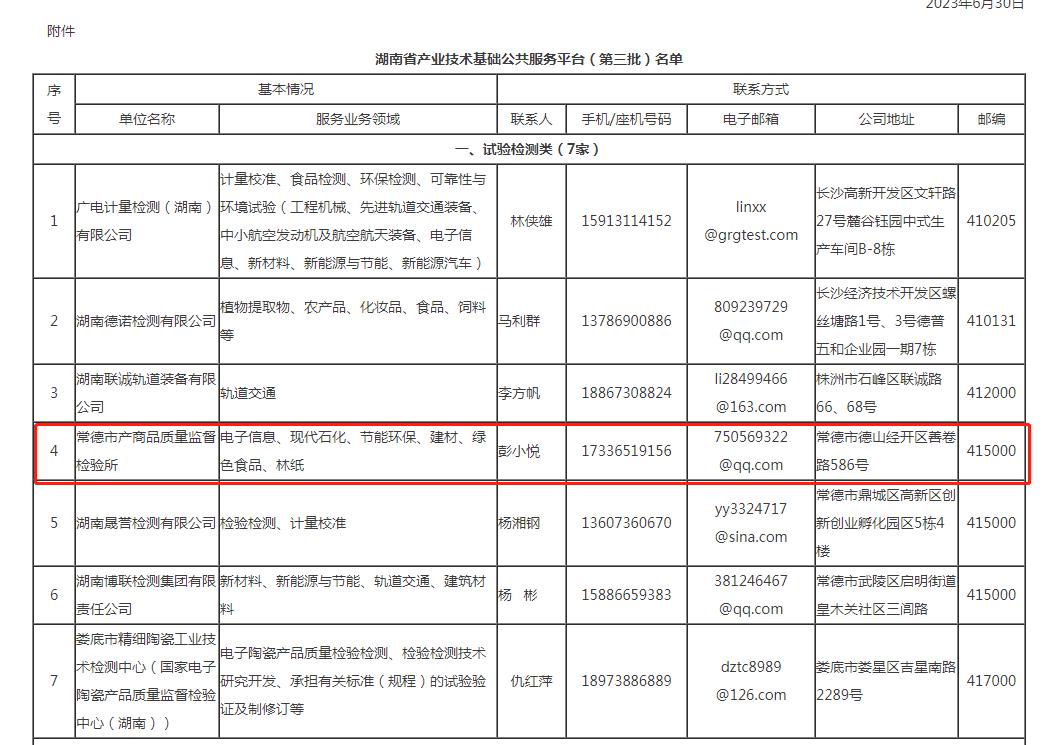 常德市产商品质量监督检验所入选湖南省工信厅第三批产业技术基础公共服务平台名单