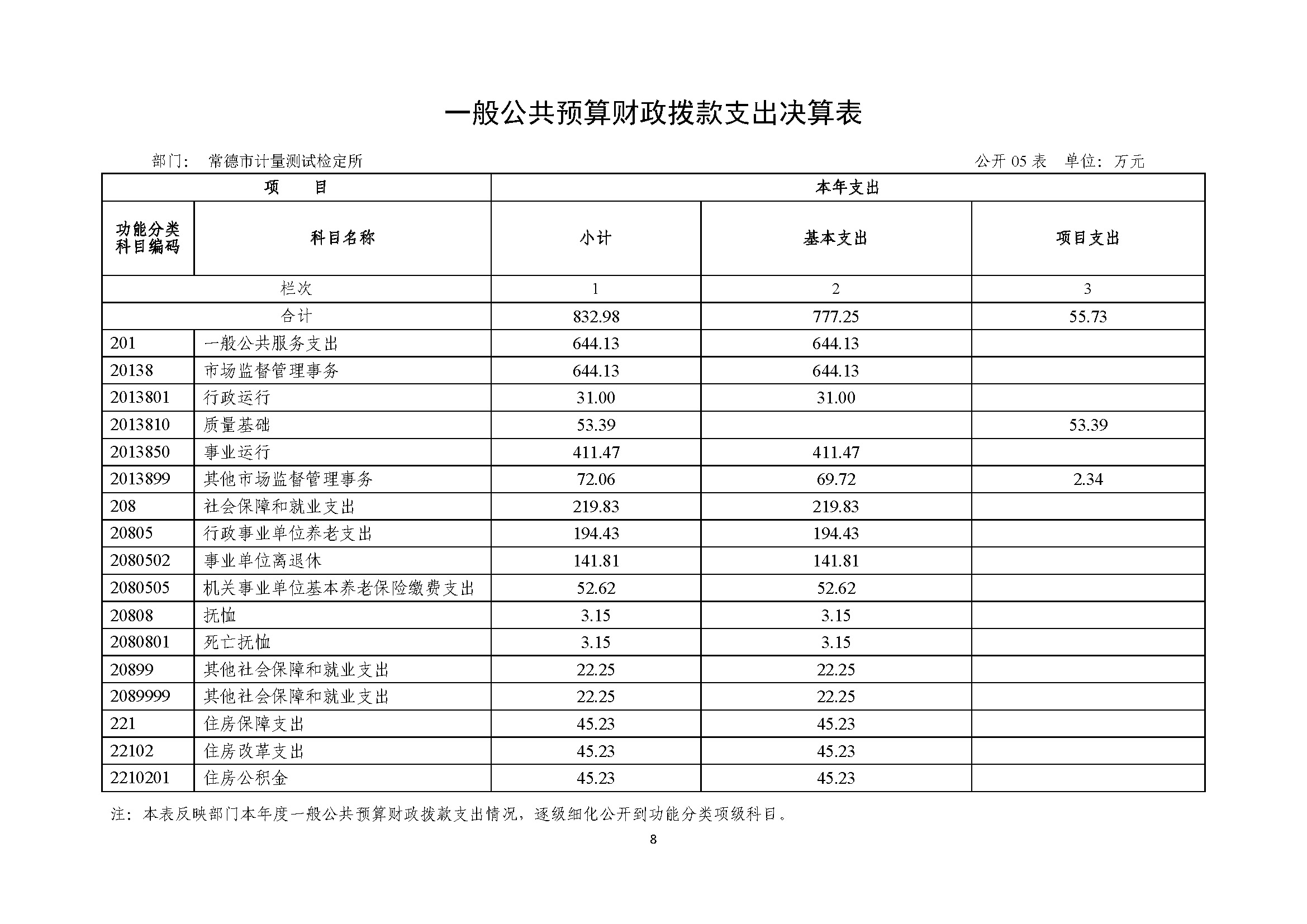 2024年度一般公共预算财政拨款支出 832.98 万元,占本年支出合计的 91.62 %。与上年相比,一般公共预算财政拨款支出减少415.54万元,降低 33.28 %,主要是因为人员经费减少,计量项目能力提升减少,纳入财政拨款的非税收入支出变更为其他支出。