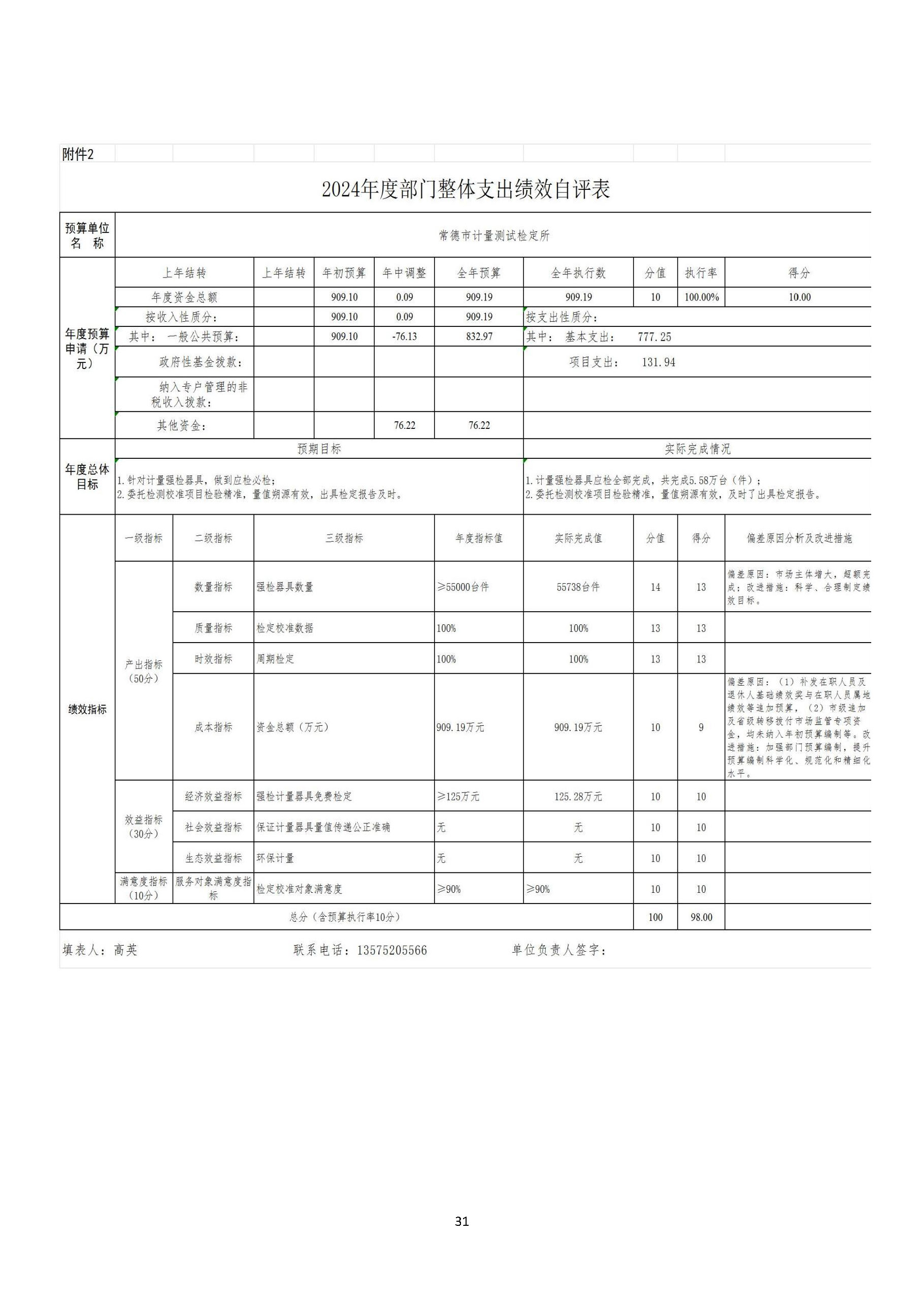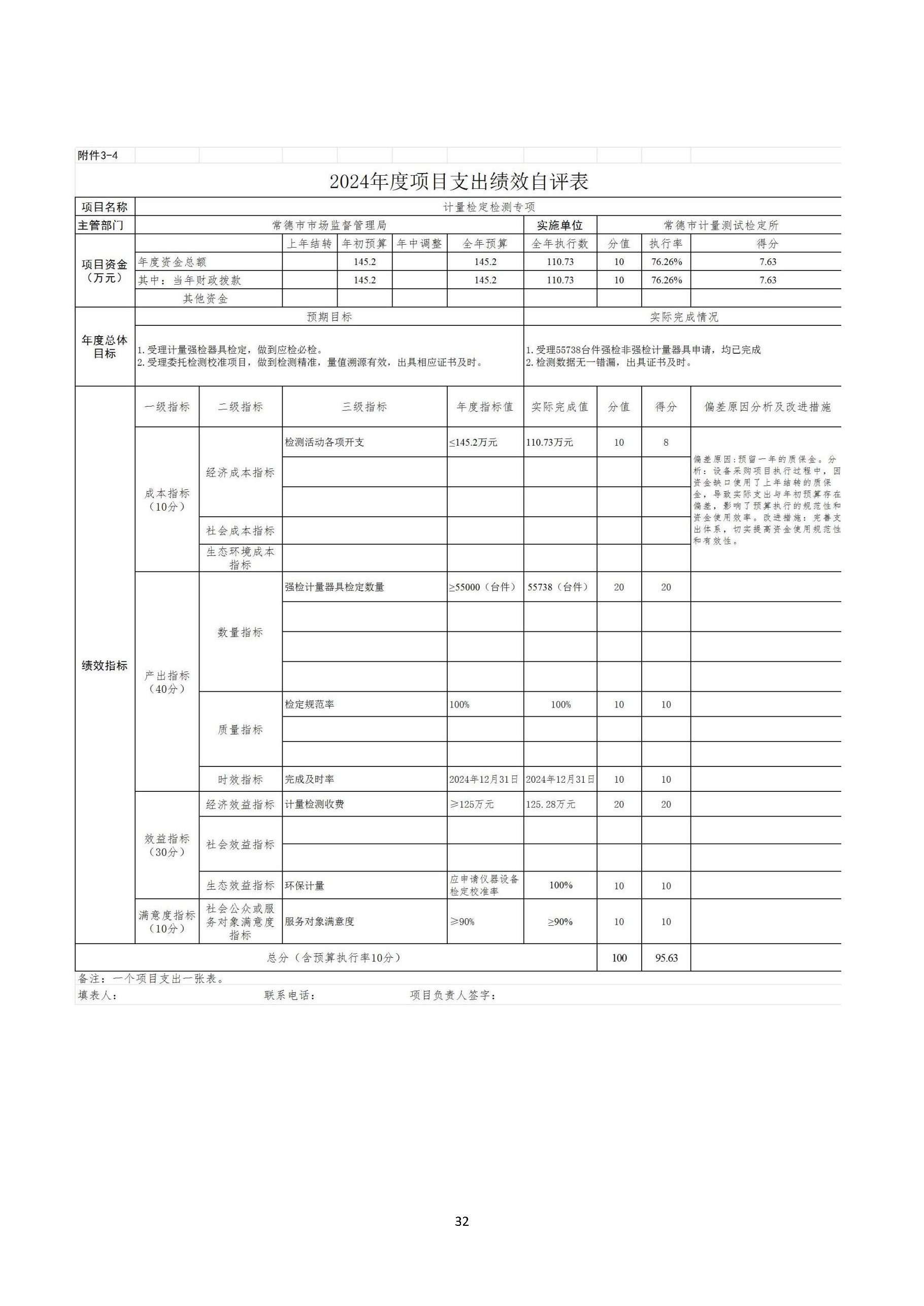 为加强财政支出管理,提高财政资金使用效益,根据预算绩效管理要求,本单位组织对本所开展整体支出绩效评价,涉及一般公共预算支出909.19万元,组织对 2024年度“计量检定检测”1个项目开展了项目支出绩效评价,涉及一般公共预算项目支出 131.94 万元,全年预算支出总额控制在预算总额以内,预算管理制度执行总体较为有效,解决公众社会活动的信息透明,向公众传递重要的计量信息,保护消费者,提高公众信任;确保计量量值的传递、溯源,可持续发展能力和服务对象满意度等方面,得到好评,经综合评价,自评结果为优;根据2024年度绩效自评,2025年度整体年初预算安排资金862.39万元,绩效目标为,计量工作器具检定校准服务,保证计量工作器具量值标,计量强检器具做到应检必检,确保量值溯源准确,委托检定校准项目出具报告及时、公正。合理安排年度预算支出执行进度,对绩效目标实现程度和预算执行进度实行双控。一是认真落实预算绩效管理目标,二是采取预算绩效执行进度公示的形式接受全体干部职工的监督。三是按有关预算绩效监控管理规定,加强预算绩效管理全程运行监控,确保各项目资金及时、合法、合规支出。