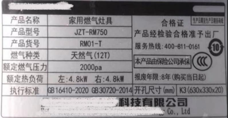 按照《家用燃气灶具》(GB 16410-2020)国家标准规定,每台灶具均应在适当位置安装铭牌,其标志内容应包括:①产品名称和型号;②使用燃气类别代号或适用地区;③额定燃气供气压力;④额定热负荷;⑤制造厂名称及商标;⑥制造年、月或出厂编号(出厂编号应有制造年、月信息);⑦额定电压(适用于使用交流电源的灶具, V);⑧额定输入功率 (适用于使用交流电源的灶具,kW/W);⑨额定频率(适用于使用交流电源的灶具, Hz);⑩II类结构的符号(仅在 II类灶具上标出);⑪嵌装开孔尺寸;⑫集成灶还应增加其他组合器具相关标准铭牌明示需标识的内容。若无标识信息或信息不全,则属于“三无”产品或不合格产品,请不要购买和使用,并向有关部门举报。自售出当日起,家用燃气灶具的判废年限应为8年,超过使用期限的燃气灶具应及时更换。