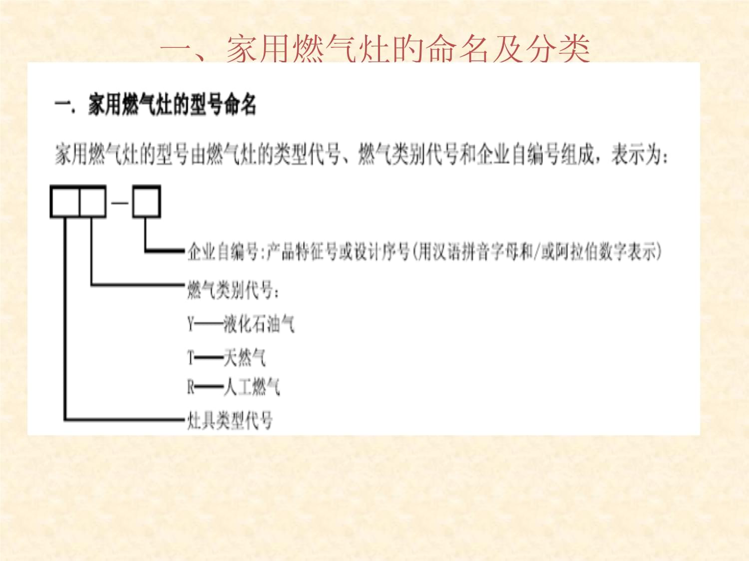家用燃气灶具按燃气类别可分为人工煤气灶具、天然气灶具、液化石油气灶具,人工煤气的代号是4R、5R等,天然气的代号是10T、12T等,液化石油气的代号是19Y、20Y等,不同燃气的代号不同,切忌混用燃气。