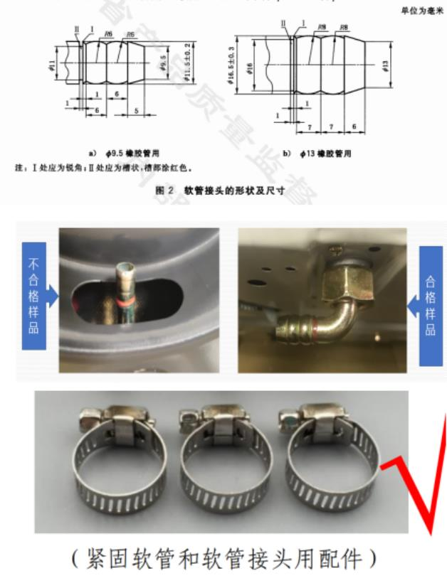 当燃气导管采用软管接头,应符合《家用燃气灶具》(GB 16410-2020)国家标准中所示的两种结构(Φ9.5mm和Φ13mm),俗称“宝塔头”结构(如下图)并且有紧固软管和软管接头用的配件。燃气导管结构不合格,可能导致燃气管脱落、漏气等风险。查验燃气导管的连接接头是否使用了防止松动和漏气的结构、槽部是否涂红色;是否配有紧固软管和软管接头的配件。
