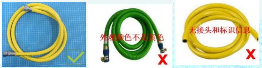 燃气用具连接用金属包覆软管被覆层表面应至少标识:制造商名称、商标、型号、国标编号、产品名称、适用的燃气类别、生产批号或生产日期、声明的使用年限等内容。软管应单件包装,并附有合格证和安装使用说明书。单件包装应标明不应用于输送“含二甲醚的介质”的警示标志等。软管长度超过2m不合格,软管被覆层应为黄色,且软管须有接头。