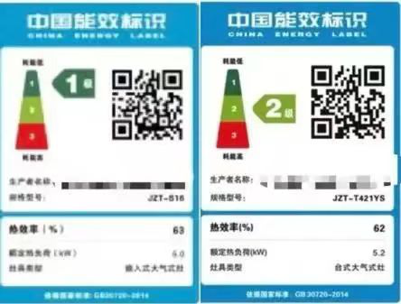 《家用燃气灶具能效限定值及能效等级》(GB30720-2014)国家标准规定:家用燃气灶具能效等级分为3级,其中1级能效最高。中国能效标识上有产品的额定热负荷和热效率,能效等级数字越小,节能效果越好,尽量选用1级能效产品。